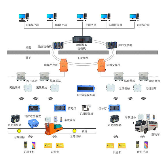 煤礦無軌膠輪車運輸管理系統(tǒng)是保障井下行車安全、提高運輸效率和運營管理水平的重要設(shè)施。為確保行車安全,系統(tǒng)設(shè)有岔口語音提示功能,岔路口時語音提示“車輛通過,請行人注意”;系統(tǒng)設(shè)有防碰撞報警功能,兩車距離較近時,系統(tǒng)會提示,前方或后方約多少米處有車輛,請司機注意;設(shè)有同步監(jiān)控功能,機車運行信息同步上傳調(diào)度室,可以同步監(jiān)控機車運行狀況,車輛調(diào)度系統(tǒng)通過優(yōu)化的閉鎖邏輯,控制井下交通燈,引導(dǎo)井下車輛有序運行,杜絕了車輛堵死、追尾等現(xiàn)象,很大程度地提高了運輸效率。
