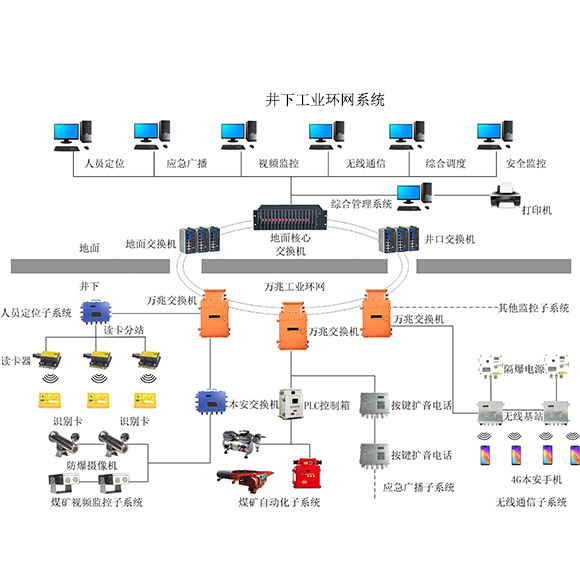 為解決這一問題,山東新云鵬結合山西省煤礦智能化建設實施意見要求,在地面機房安裝2臺核心匯聚萬兆交換機,井下中央變電所、采區(qū)變電所等固定硐室安裝5臺礦用隔爆型萬兆交換機,完成對工業(yè)環(huán)網升級擴容改造,形成萬兆工業(yè)主干環(huán)形網,實現了礦井人員定位、應急通信廣播、產量監(jiān)控、視頻監(jiān)控、防越級跳閘、智能化掘進工作面等系統(tǒng)數據統(tǒng)一傳輸。